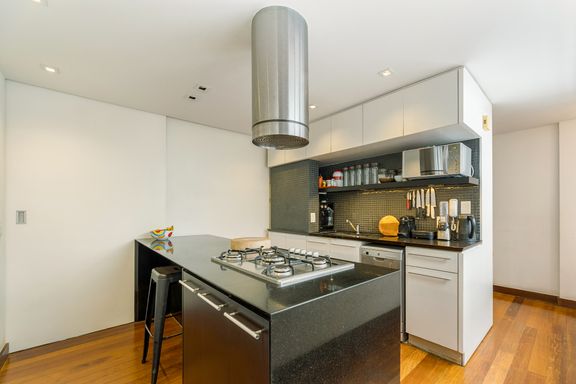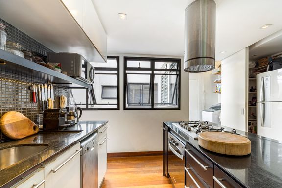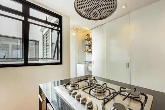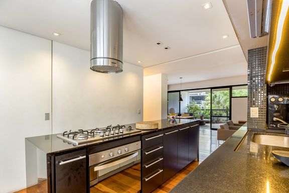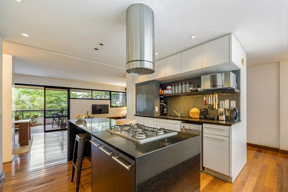 planejada com ilha e coifa e a opção de deixar a grande porta de correr