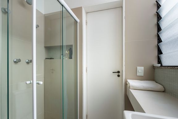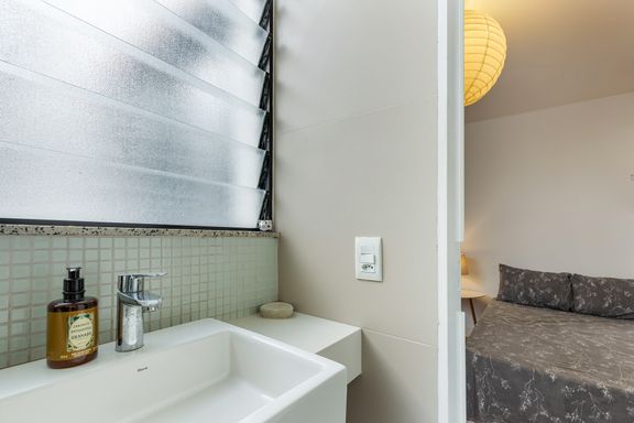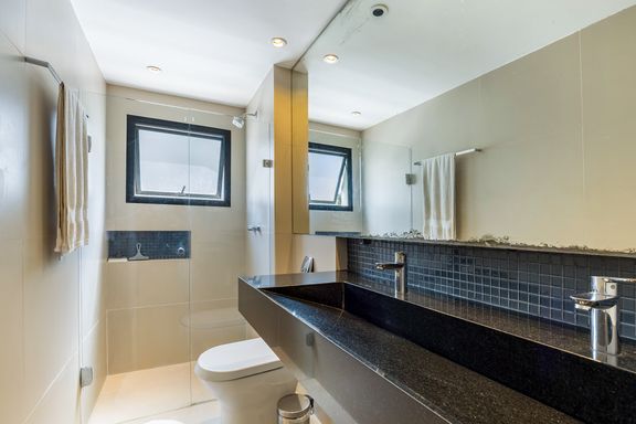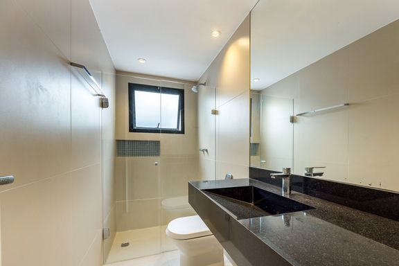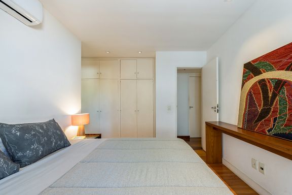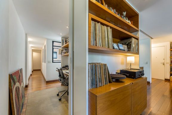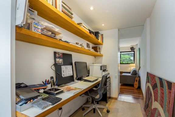 Na área íntima, uma área reservada para home- office, mais 3 quartos, sendo 2 suítes, a suíte principal com armários e banheiro confortável, um segundo quarto com um banheiro completo na circulação com uso exclusivo deste, e uma segunda suíte, onde o banheiro ficou reversível para ela e para o uso eventual de funcionária.