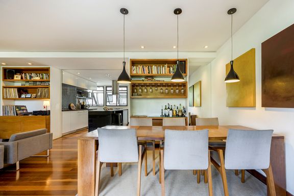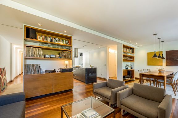 Destaque para o conceito integrado da sala em ambientes de estar e jantar,
