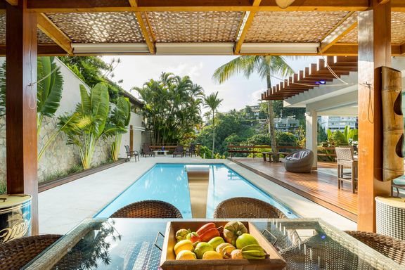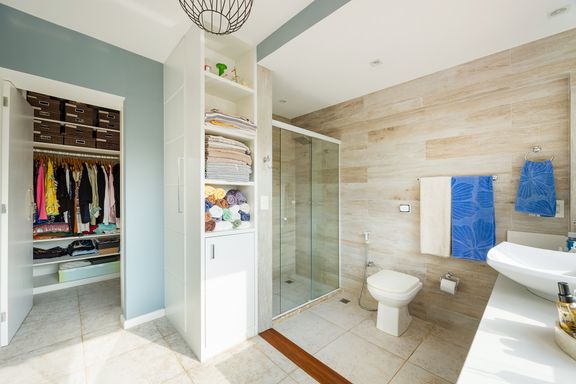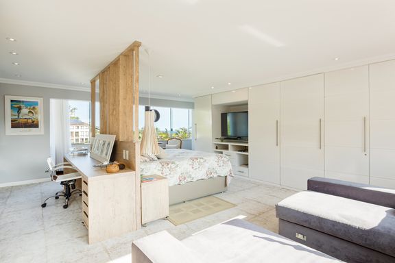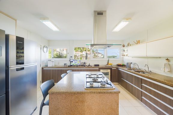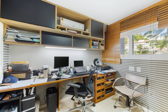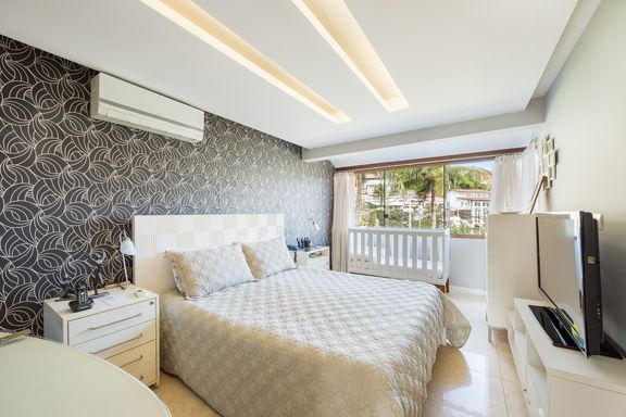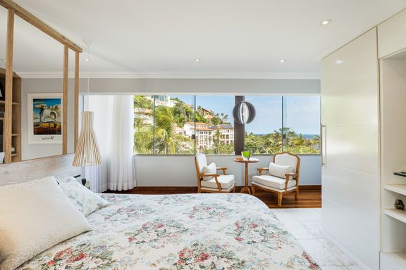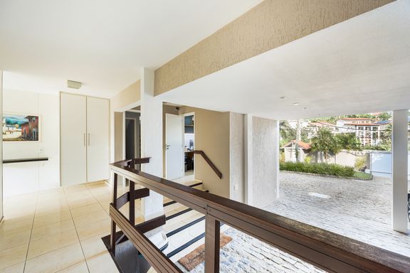 A área íntima é composta por uma suíte master espetacular, repleta de armários, com vista para ambos os lados, mar e montanha e banheiro espaçoso, um outro quarto grande usado como sala de TV, mais 3 suítes completas.