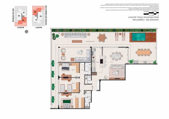 Maravilhoso terraço com vista para a Pedra da Gávea, com piscina privativa e ambiente externo de estar, mais espaço destinado à mesa externa, integrada ao espaço gourmet.