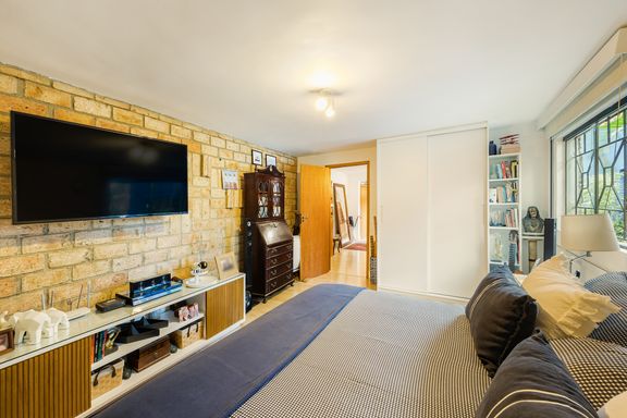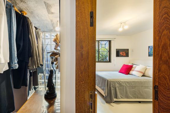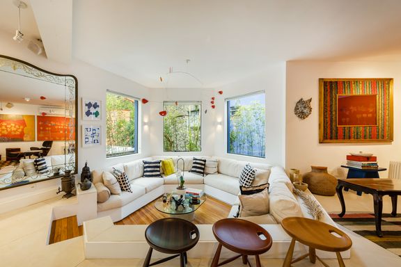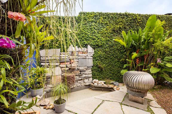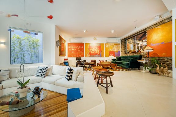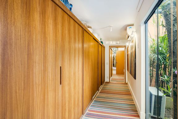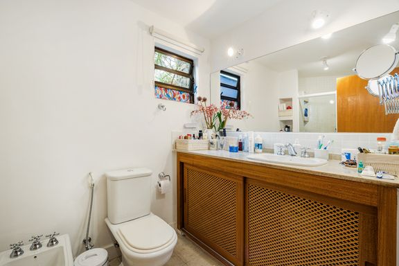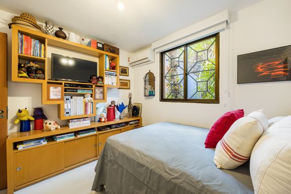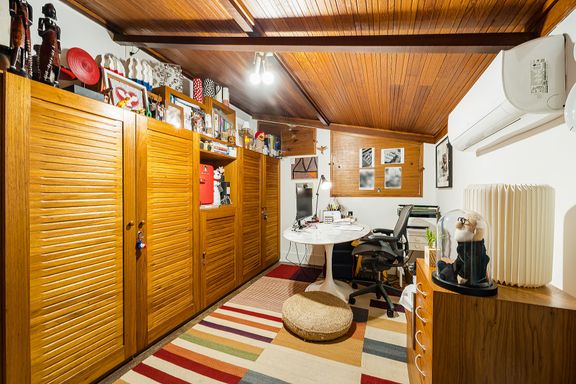 todos aconchegantes e charmosos, destaque ao belo telhado com janela em clarabóia que emoldura a Pedra da Gávea. A sala é conectada a uma varanda frontal super aprazível e também à um charmoso jardim de inverno com fonte. Existe também um lavabo e escritório.