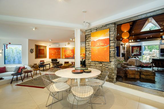 A casa é composta por sala de estar com vários ambientes, incluindo jantar,
