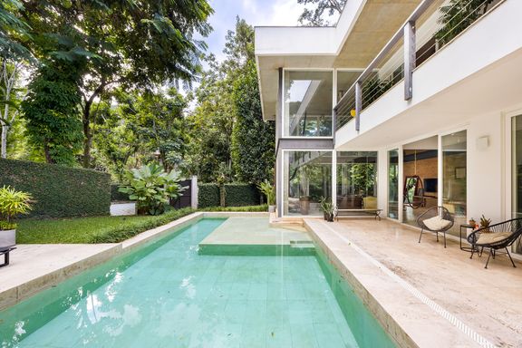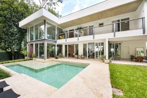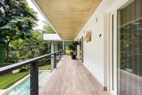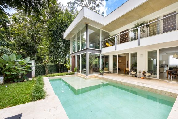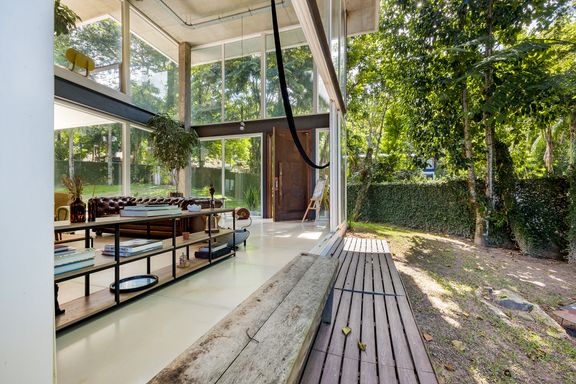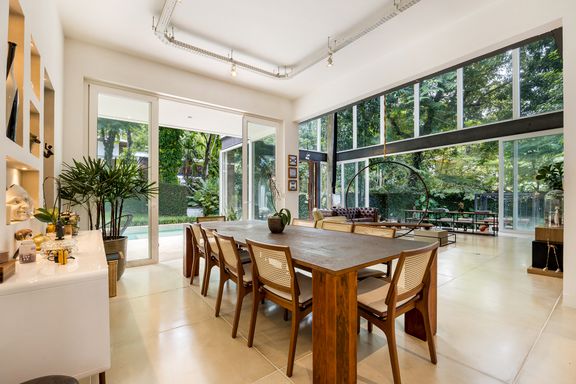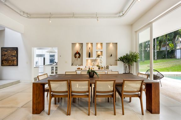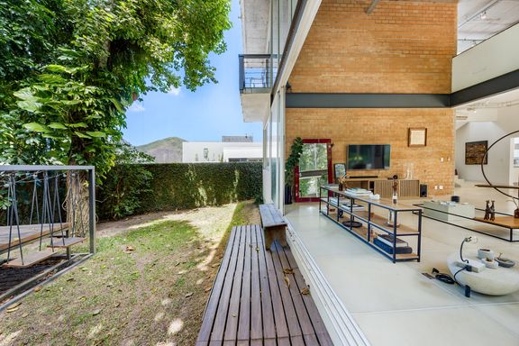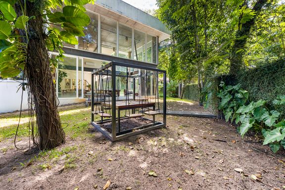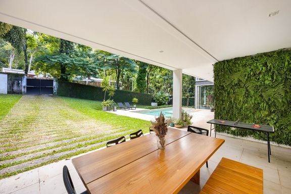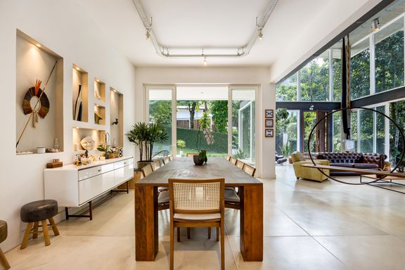 metálicas, composta por ambiente de estar e jantar que comporta uma mesa para 12 pessoas, em total integração com o verde, lavabo e uma suíte térrea usada como escritório.