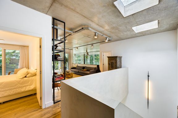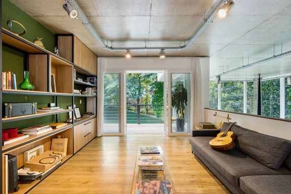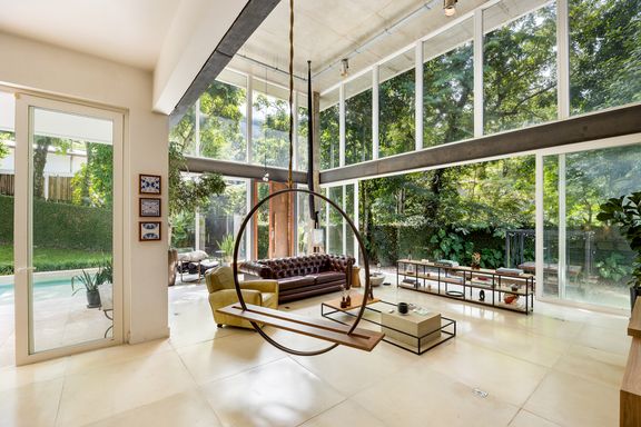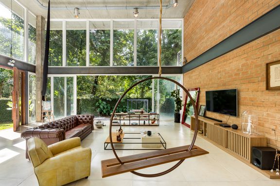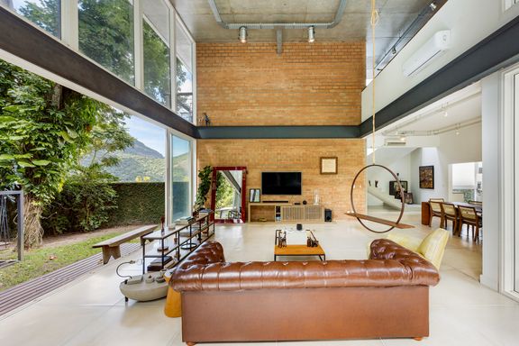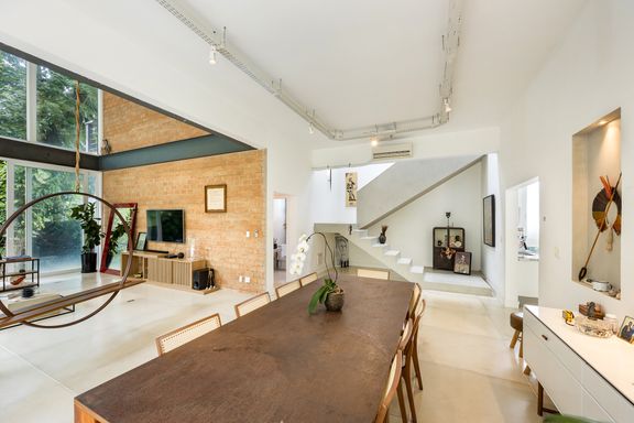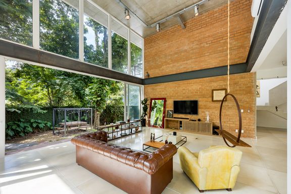 modernista, é a incrível sala com o pé direito de 7 metros, estrutura de vigas