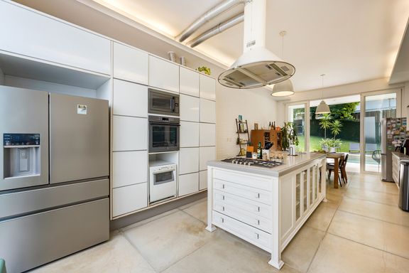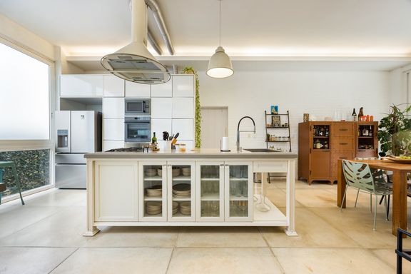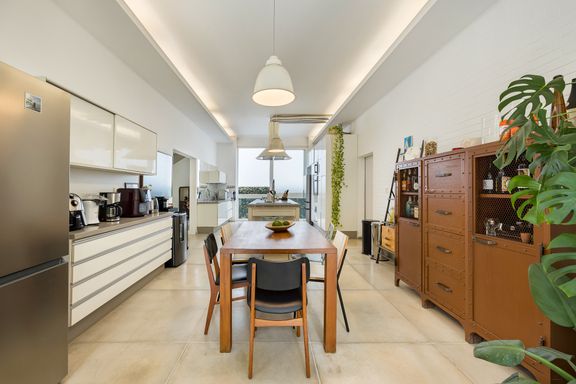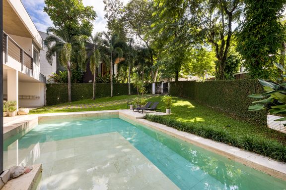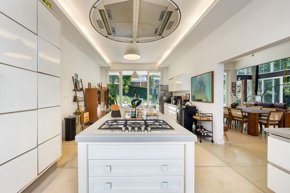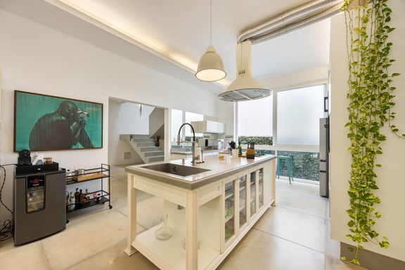 A cozinha Gourmet é deliciosa, com pé direito de 3,5 metros e ventilação em ambos os lados: detalhes como a coifa retrô, ilha central com marcenaria com silestone cinza e armários industriais e um armário industrial de Farmácia antiga pintado na cor de aço Corten, conferem um charme especial à esse espaço incrível! Perfeito para reunir a família, receber amigos ou convidados, pois além de integrar-se a área coberta de varanda, com espaço para jogos e mesa externa, ainda integra-se ao jardim com vista para a bela piscina revestida em travertino natural, com ilha e faixa de natação e banheiro externo completo.