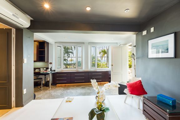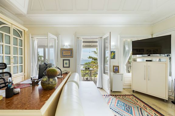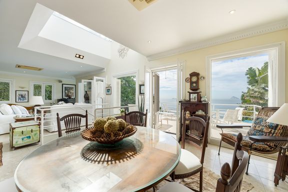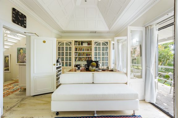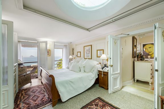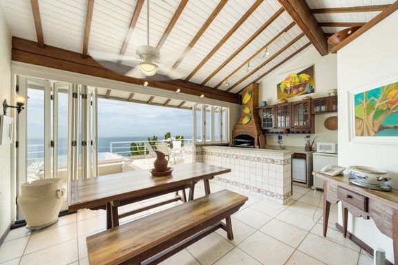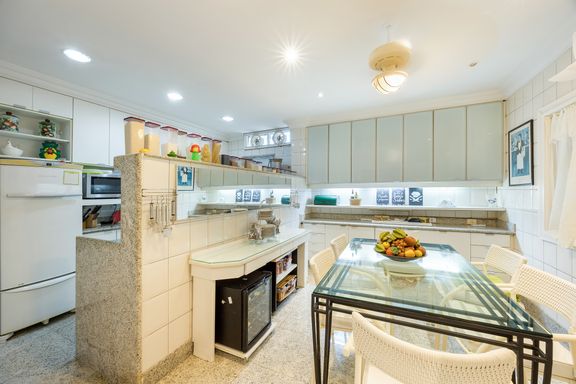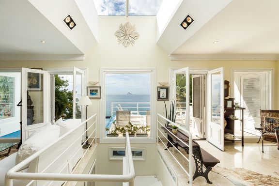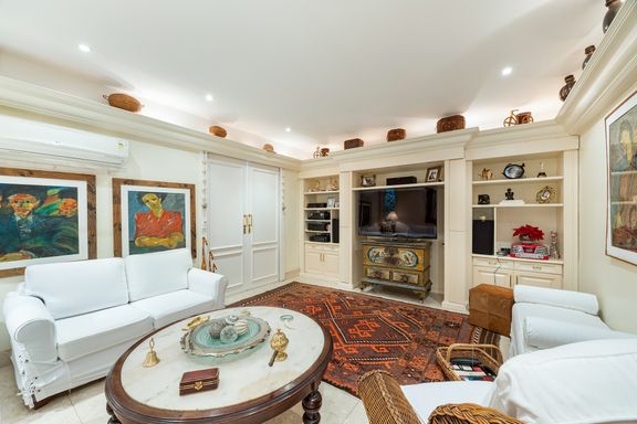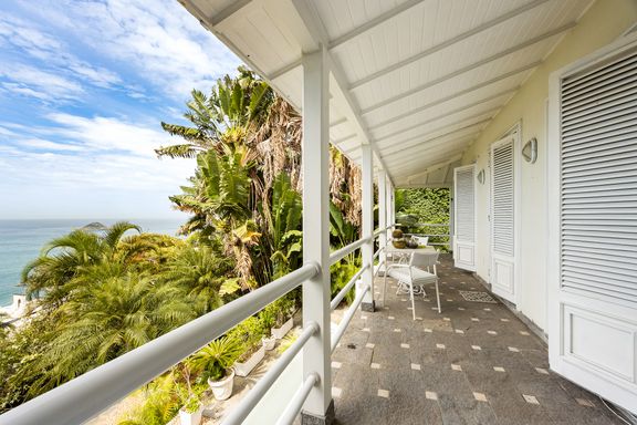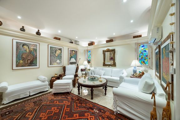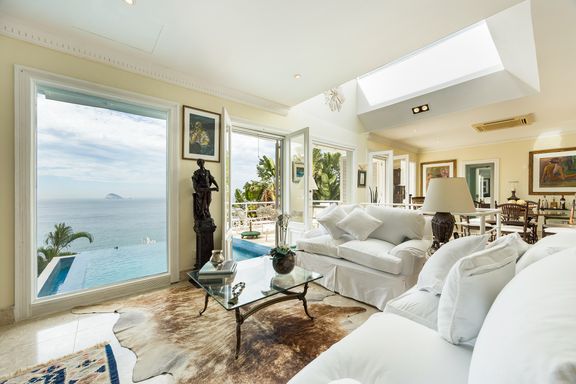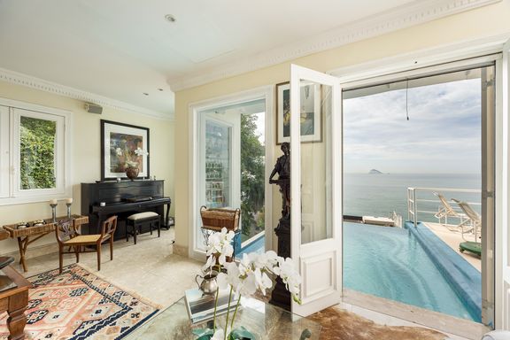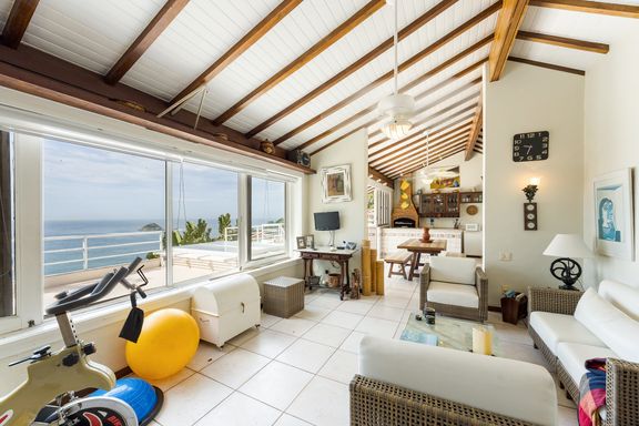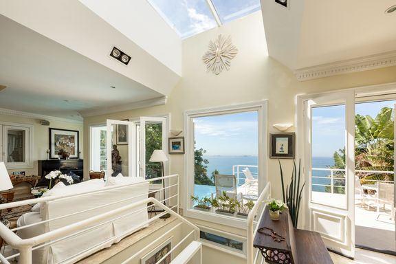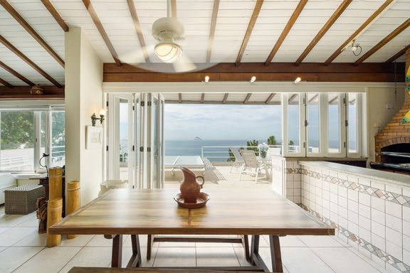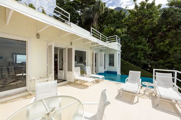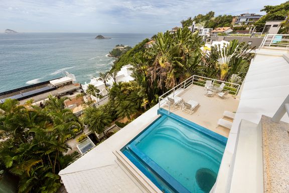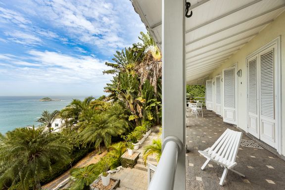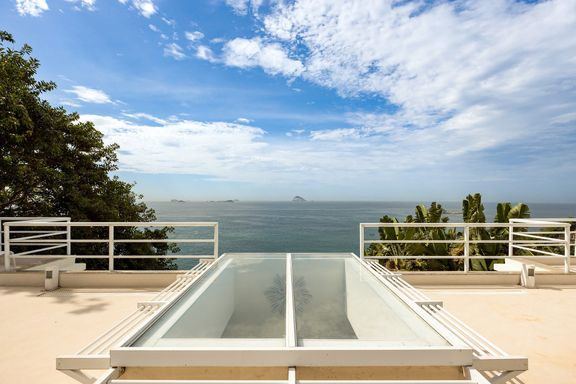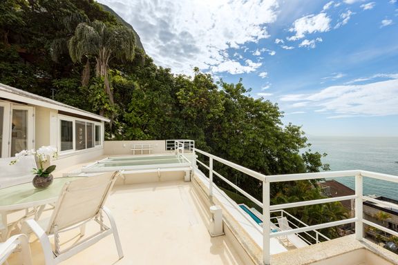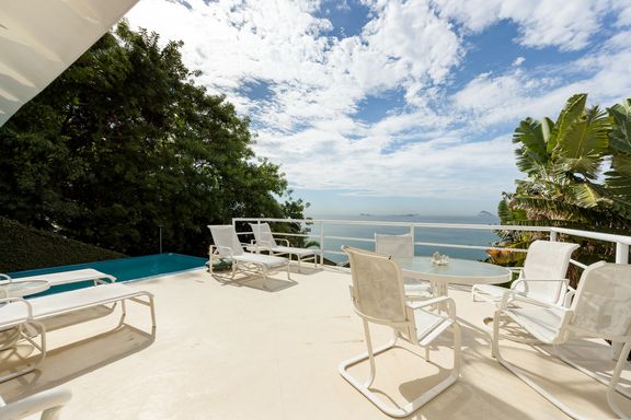 Residência em estilo caribenho com vista deslumbrante para o mar, floresta da Tijuca e Pedra da Gávea, em condomínio de alto luxo e total segurança.