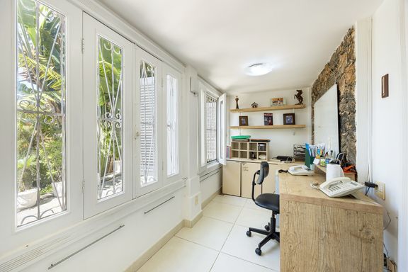 Dispõe de cinco suítes, sendo duas delas usadas como home office e as outras duas, com acesso à varanda coberta que circunda todo o segundo andar.