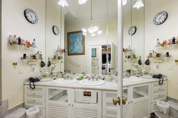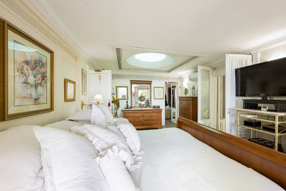 Na suíte máster, destaque para o fundo de piscina aparente no teto, dois closets e banheiro com hidromassagem.